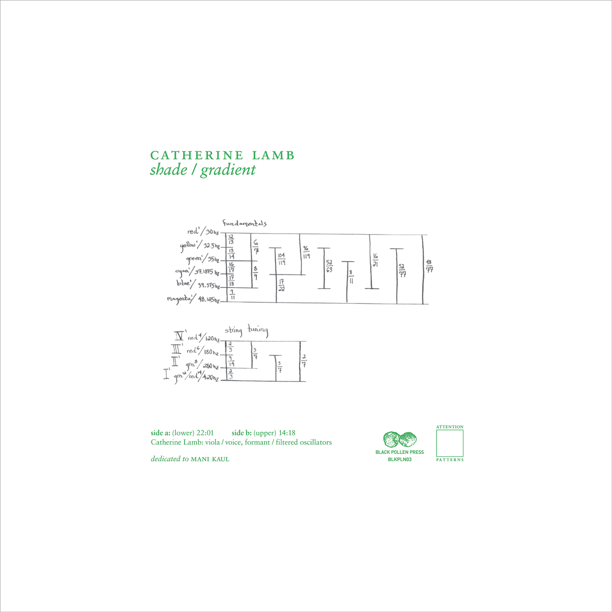 Catherine Lamb’s work is characterized by an insistence on what she calls the “interaction of tone”. Precisely tuned intervals, played slowly at subtle volumes, blend and generate a host of difference and combination tones, phasing, beating and aural illusions. Her ensemble and orchestral compositions have been performed in grand halls and d.i.y. spaces alike, played by underground musicians and institutional ensembles including the BBC orchestra. Yet sometimes ideas must be stated in ways that reflect their most basic, unfettered reality and indeed, shade/gradient contains all of the elements of Lamb’s orchestral and ensemble music in their most intimate, radically distilled form. Lamb met Mani Kaul by happenstance at CalArts, where she was a student and he a visiting filmmaker. Though best known for his films, Kaul was also a long time student of the great Indian dhrupad musician, ZM Dagar, and their chance encounter would introduce Lamb to the sonic and philosophical concepts of dhrupad music in the Dagar tradition. The score to Lamb’s shade/gradient bears a dedication to Mani Kaul, and the piece’s oceanic sense of time and emphasis on the most subtle shifts in resonance and intonation make the connection to dhrupad concepts clear, while it’s slowly unfolding structure and tuning system also point towards Morton Feldman and her studies with James Tenney. Performed by Lamb herself using only viola, formant oscillators and her own voice, the piece also falls into the lineage of composer performed solo works like Pauline Oliveros’ Horse Sings from Cloud for accordion and voice, or the ARP synthesizer works of Eliane Radigue (who has composed an as-yet unperformed piece for Lamb). |